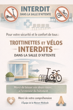 Dans la mesure du possible, nous vous demandons de venir seul et pas plus de 10 minutes avant l'heure du rendez-vous afin de ne pas avoir trop de monde en salle d'attente.